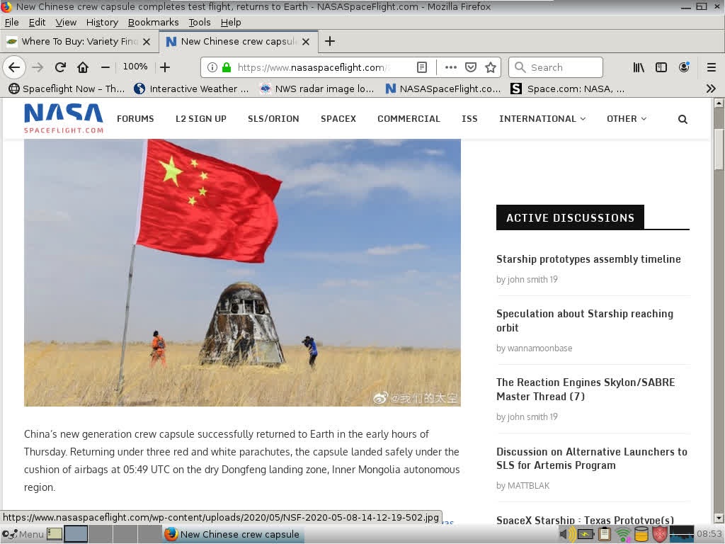 Pictures from Chinese media showed the capsule descending under three parachutes. The vehicle had made a high-speed reentry from a final orbit of 523 x 6,278 km (325 x 3,901 miles) to simulate a return from deep space.