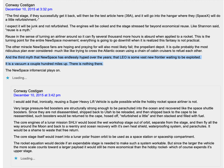 The spacex P.R. machine has of course not mentioned exactly how much money they save on reusing rocket stages: exactly how much it costs to turn around a falcon 1st stage compared to just dropping it in the ocean. If you think it is a tremendous savings you are deluded. 5 years ago this guy Conway was not far off and it was of course wishful thinking. It would have been far better for space exploration if spacex had gone out of business. Too bad.