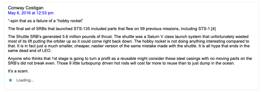 The reality is that if they had not gone cheap on the shuttle and a few design features had been different then the Space Transportation System would have been far more economical and would still be flying. Even though it was designed in the 70’s it would be superior to this miraculous hobby rocket the fanboys worship at the altar of today. The Air Force and that deal Nixon made with the people in Utah were the main villains.