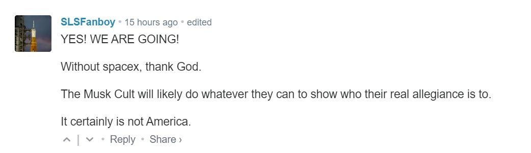 The first spacex fanboy arrives to praise SLS after years of death-to-SLS rants and NASA-bashing.